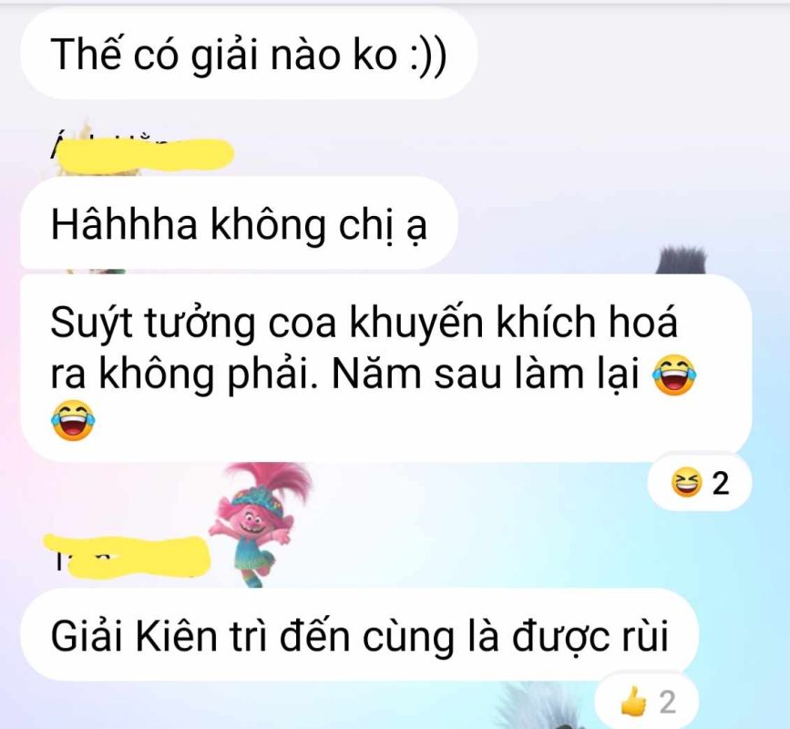 Lạc quan thì chúng mình có thừa. Lạc quan đến mức, cả team nhất định phải ở lại chờ xem “chúng mình có được giải gì không, vì team mình có bạn thắng 2 trận, có bạn thắng đến 4 trận rưỡi, có khi được giải khuyến khích ấy cô ạ!”