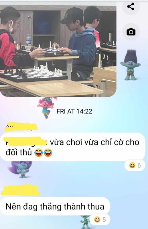 Chiến sỹ khác thi xong ra, cô hỏi: “Sao con?” – Tự tin đáp: “Tốt ạ. Suýt thắng cô ạ.” – “Ủa, thế là thua à?” – “Không, suýt thắng chứ cô. Tại vì bạn í xin con cho bạn í ăn quân hậu của con, nên con đồng ý cho bạn í ăn quân hậu!”. Cô nghe xong chẳng hiểu thế rốt cục như nào, nhưng không sao, vẫn tự tin là được.