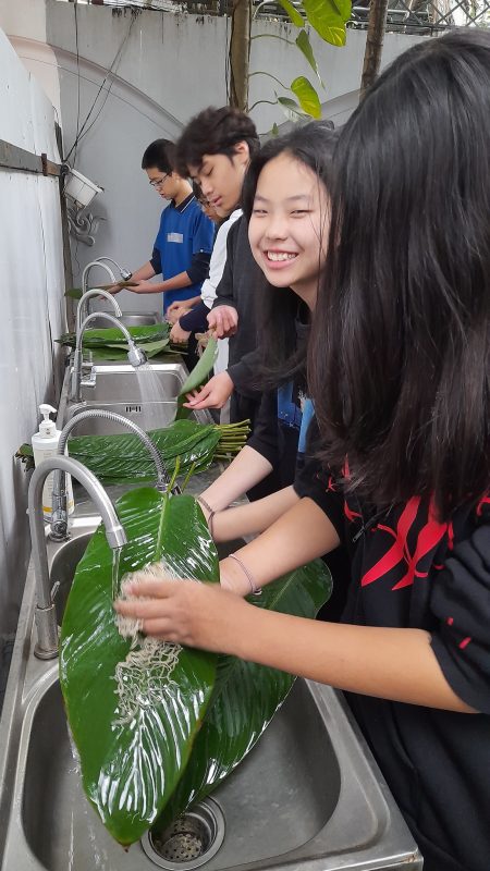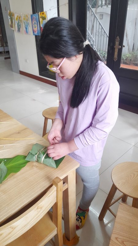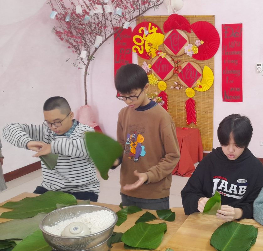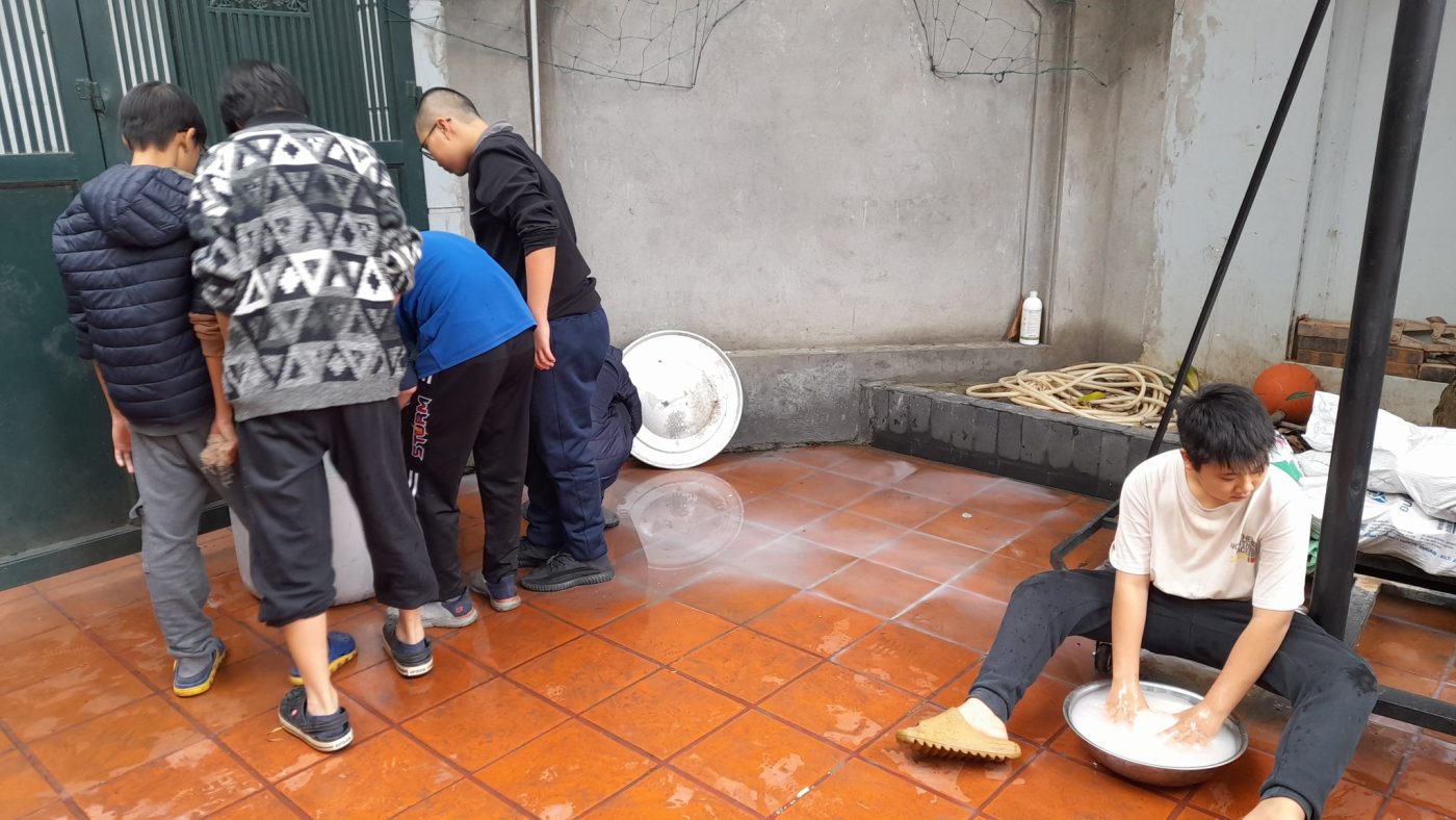 Vào ngày đó, học sinh cùng nhau chuẩn bị rửa lá, vo gạo, thái thịt và ….. gói bánh.