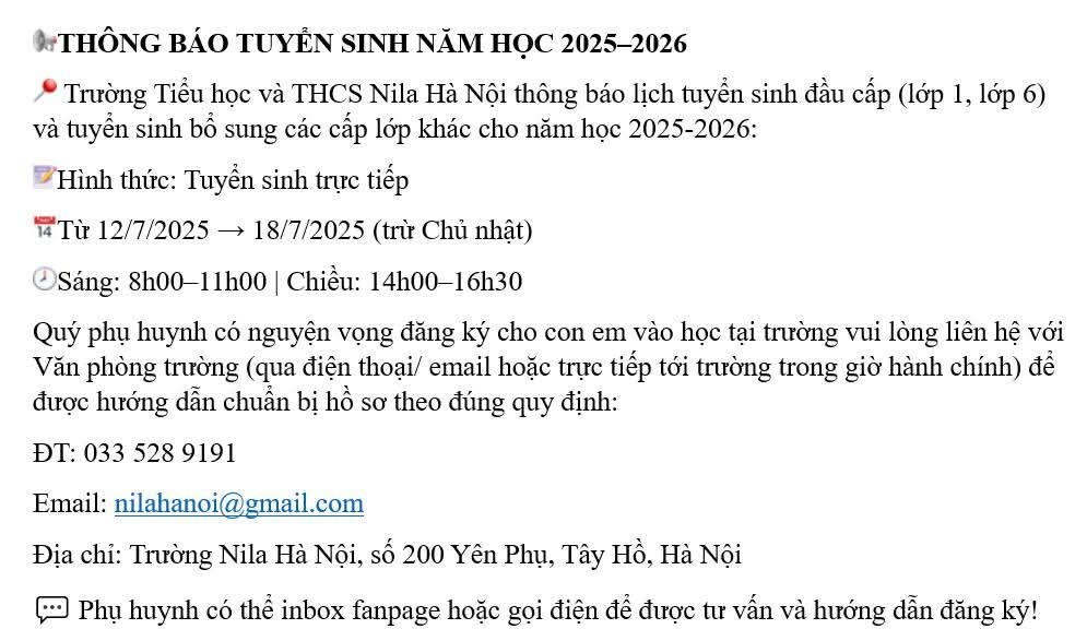 Sự kiện/tin tức, Tuyển sinhTHÔNG BÁO TUYỂN SINH Posted on 12 July, 202520 November, 2025 by Nila Hanoi 12 Jul Trân trọng. Nila Hanoi MỞ THÊM ĐĂNG KÝ KHÓA TRẢI NGHIỆM HÈ NILA 2025 (KHỐI TRUNG HỌC CƠ SỞ) Rộn Ràng Ngày Tựu Trường 2025-2026
